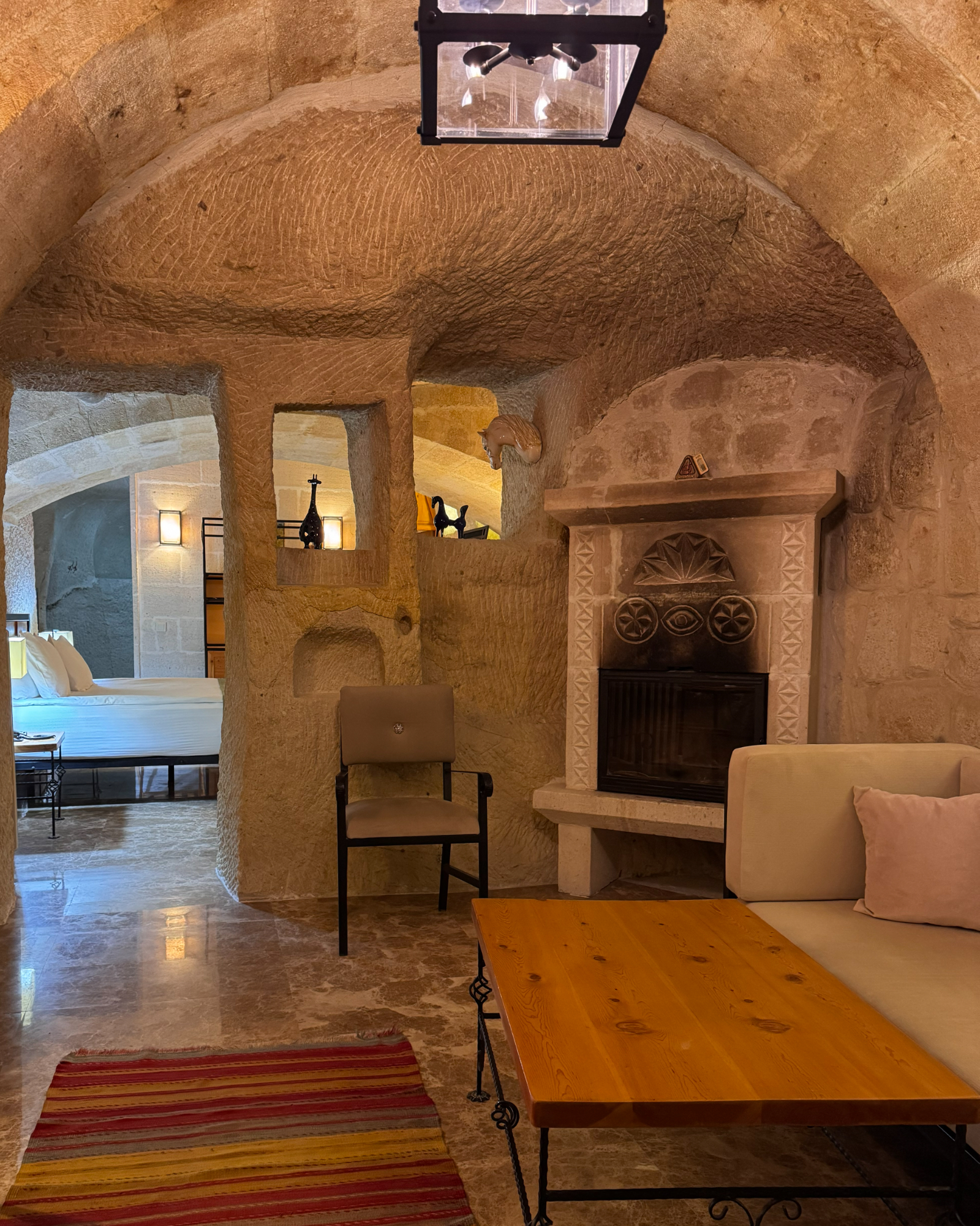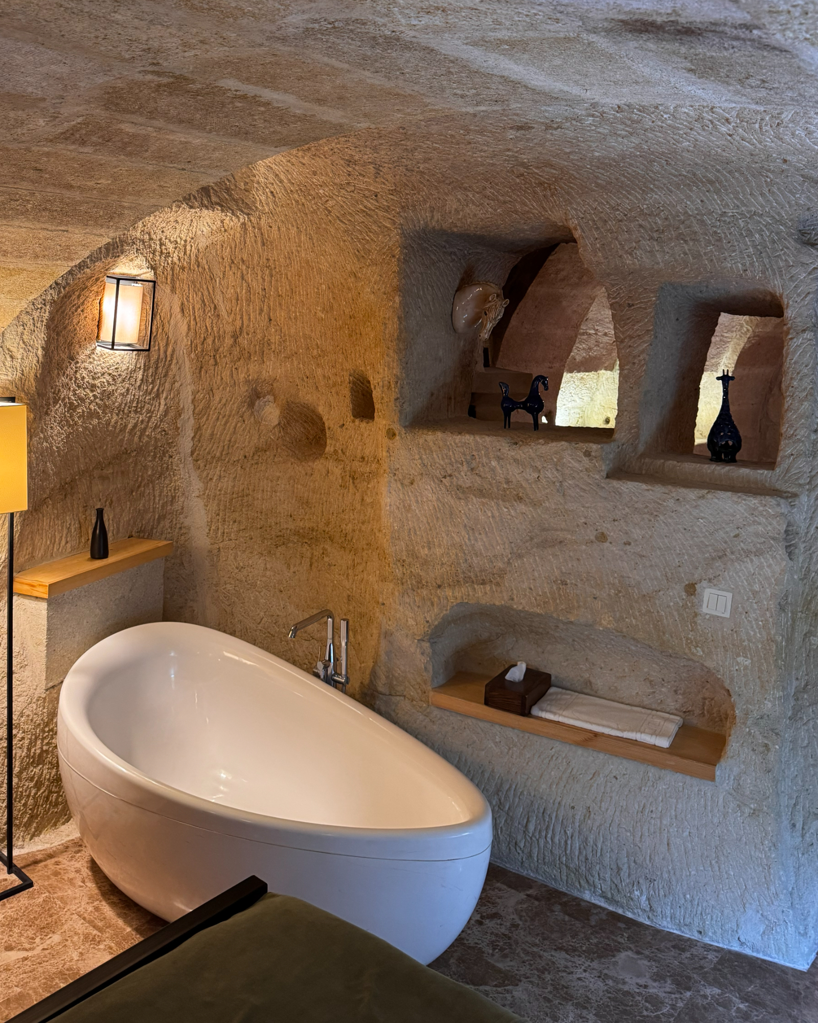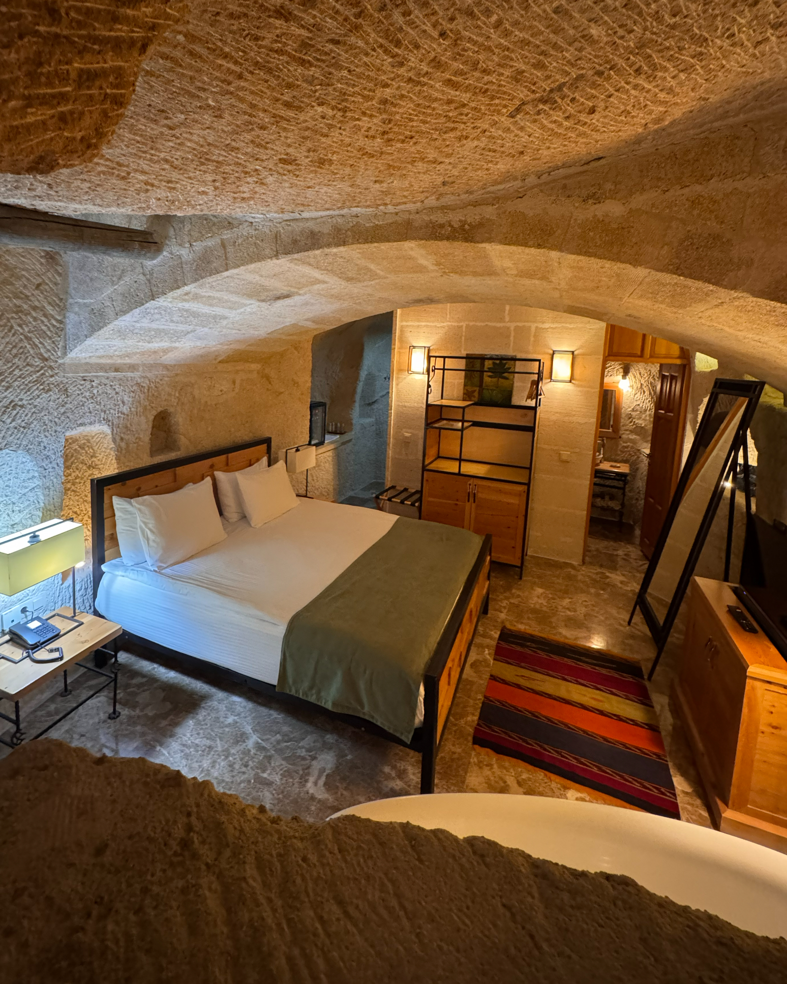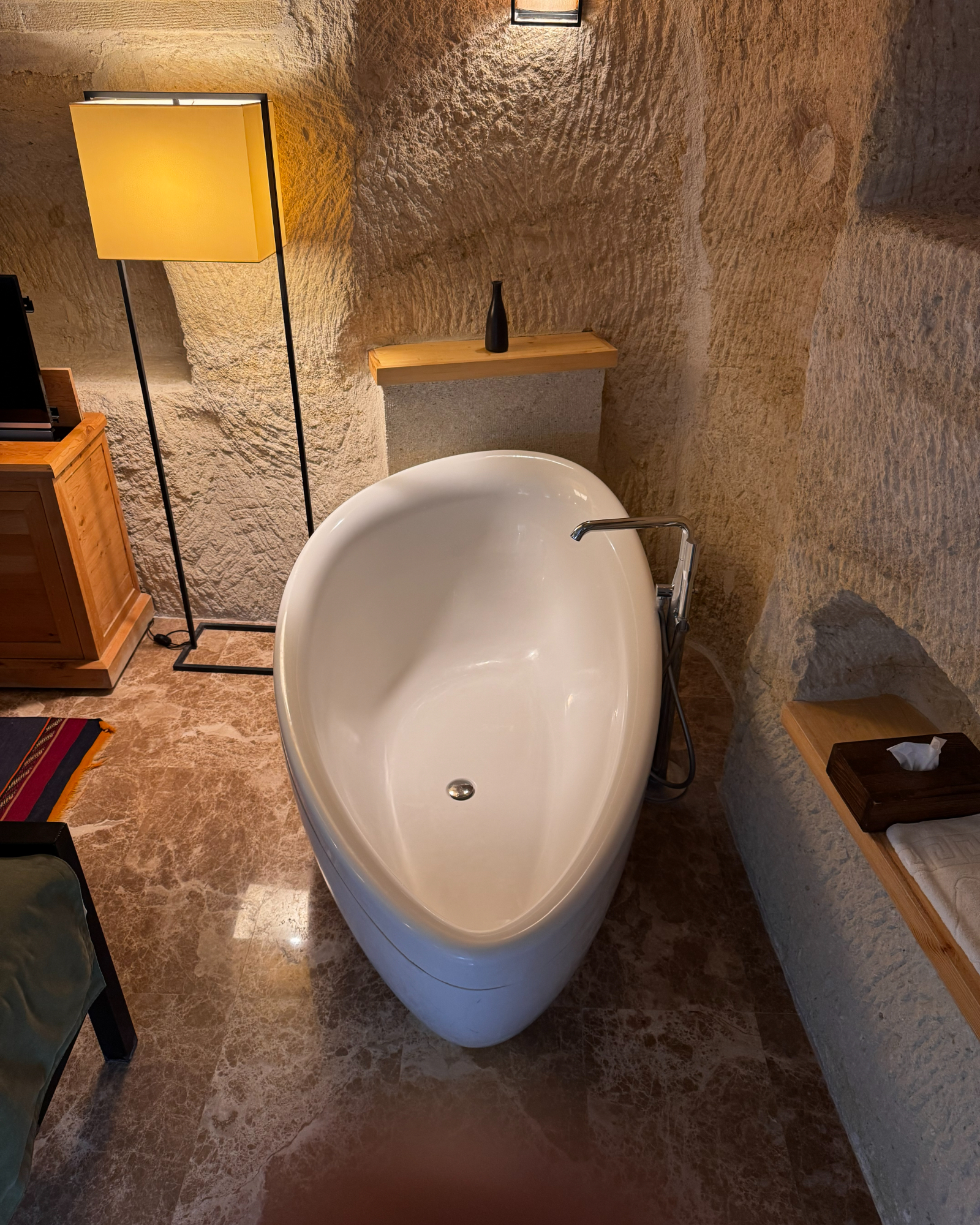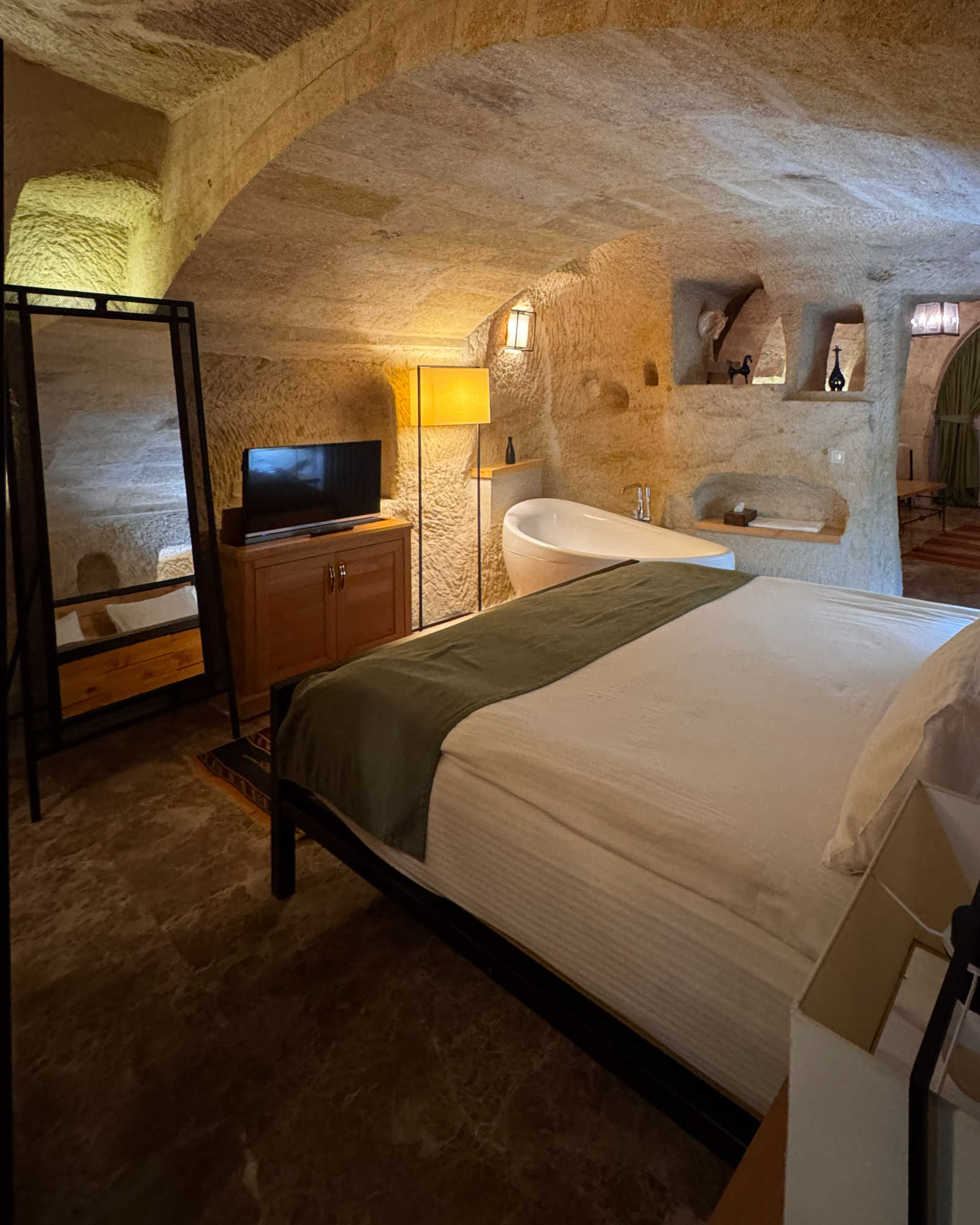 The Superior Cave Suite offers a luxurious and comfortable cave suite experience in Cappadocia, featuring a drop-shaped bathtub, fireplace, and views of Çavuşin Castle.